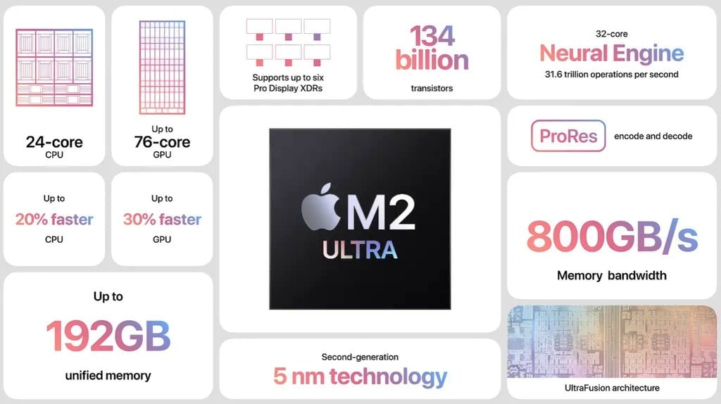 Самый мощный чип Apple на рынке, M2 Ultra, представляет собой комбинацию двух чипов M2 Max с помощью функции UltraFusion. Это позволяет использовать 24 вычислительных ядра, до 76 ядер GPU и поддерживать до 192 Гбайт оперативной памяти.
